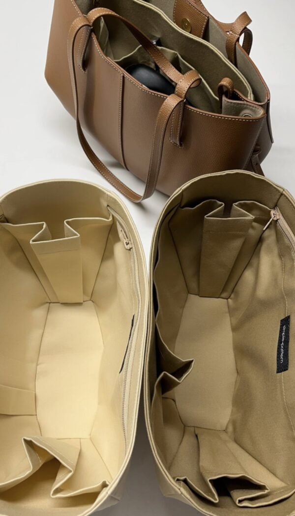 Zdjęcie produktowe przedstawia organizer w kolorze ciemnego beżu, który najbardziej pasuje do wnętrza Polene Cyme w wersji TEXTURED – skórzanej – wszystkie kolory.